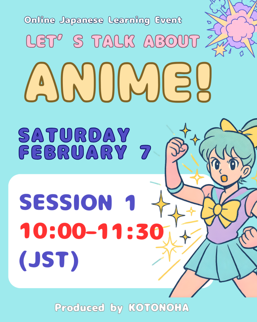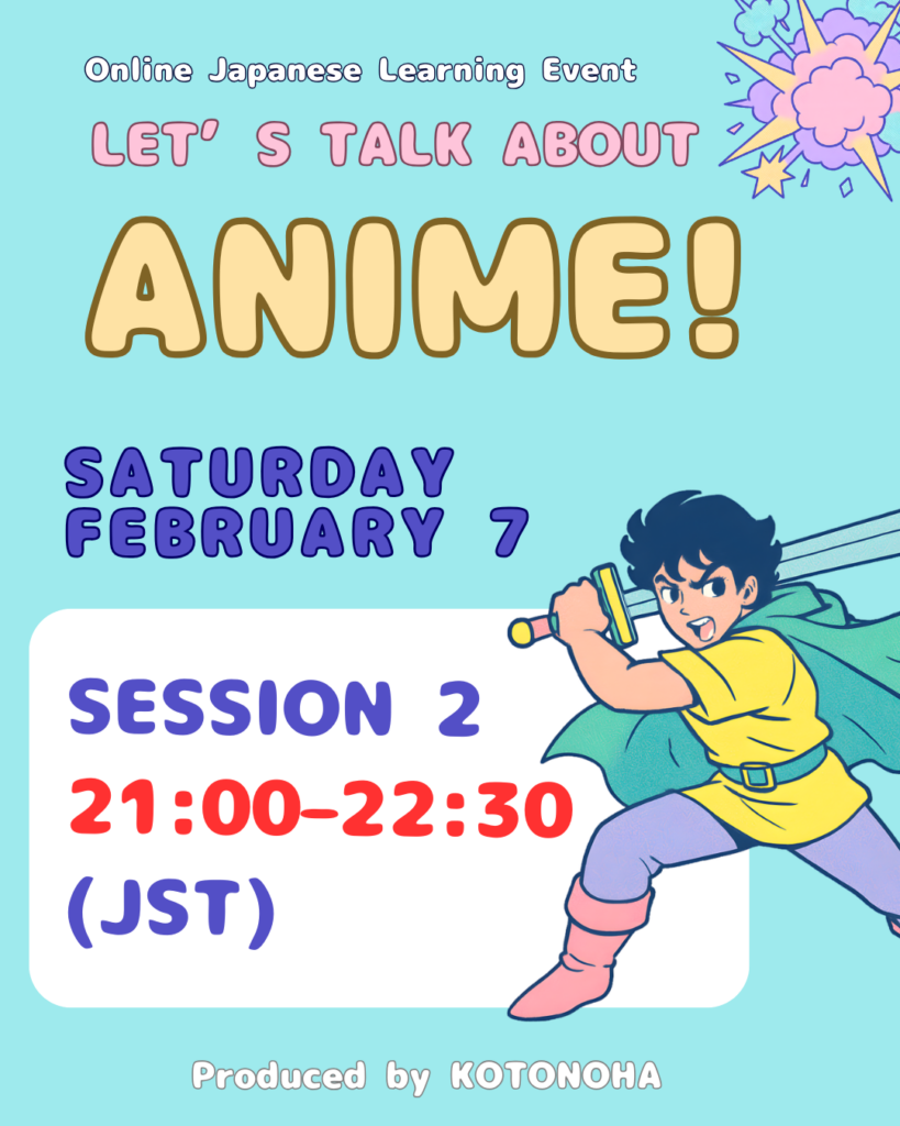 Hello everyone who is learning Japanese!This is Japanese Language Studio KOTONOHA. We are happy to invite you to a friendly and fun online event where you can practice speaking Japanese in a relaxed atmosphere. Do you like anime?In this event, we will practice talking about anime in Japanese. 🗂 Event Schedule Opening Self-introductions Let’s talk […]