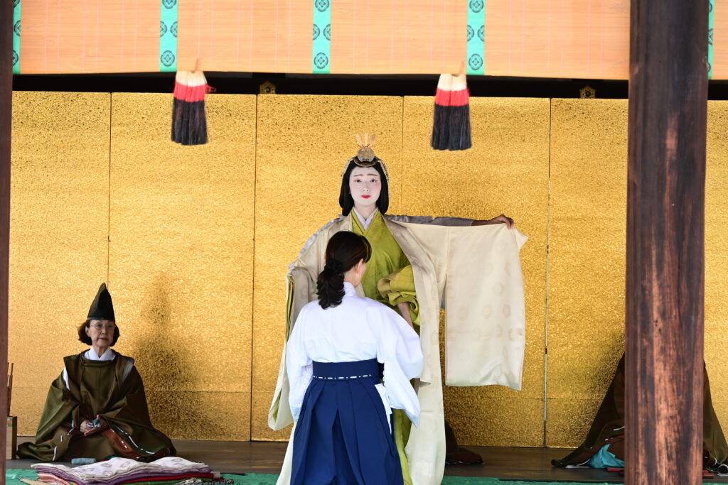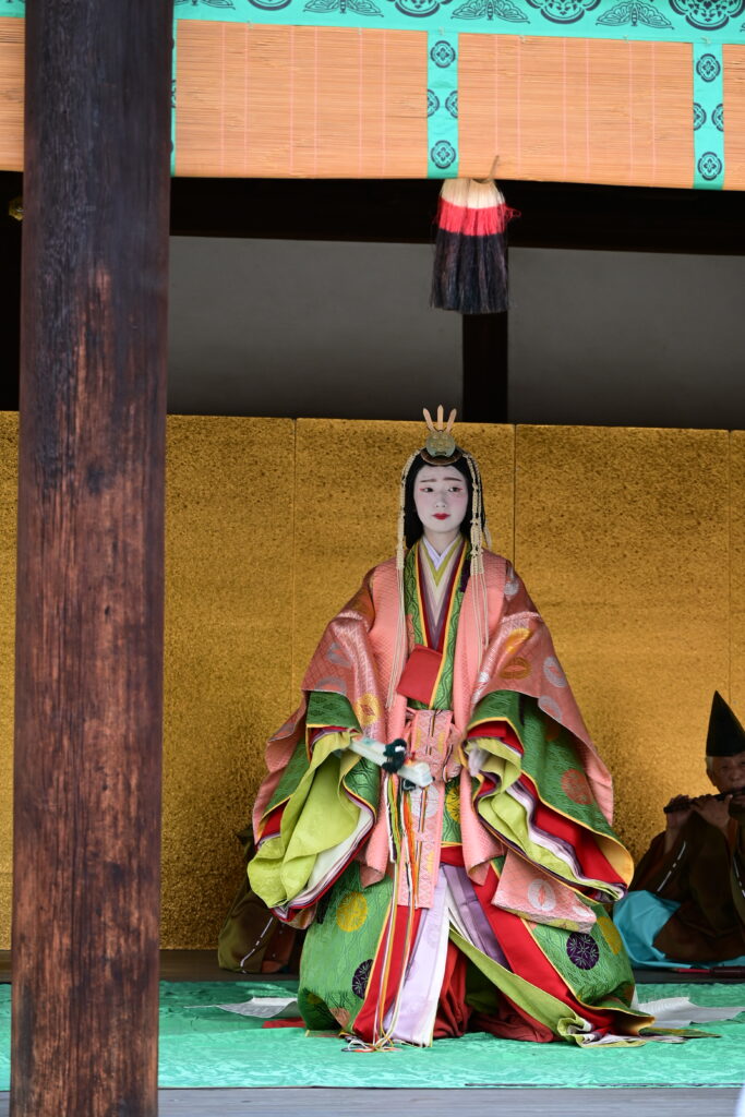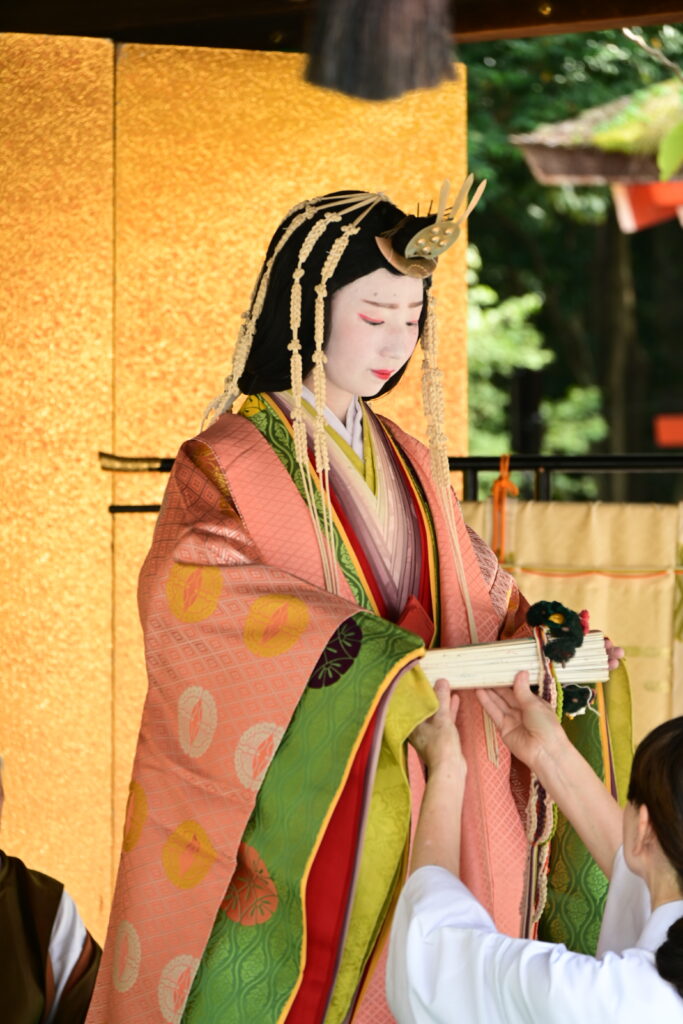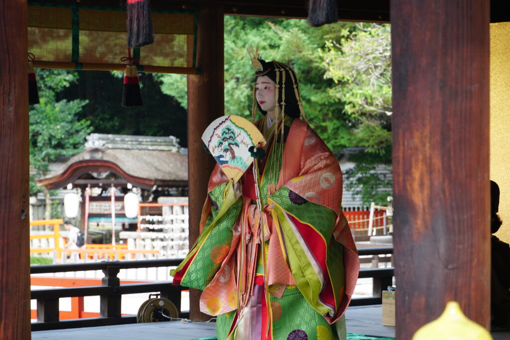 On the day of the Seal Prayer Festival, a Jūnihitoe dressing demonstration was held on the Shimogamo Shrine stage. The Jūnihitoe refers to the ceremonial court attire for noblewomen, the Karaginu mo10, established in the late Heian period. It was an adaptation of Chinese clothing, modified to suit the unique Japanese lifestyle of sitting on floors. Following the cessation of the missions to Tang China11, Japan’s fashion culture blossomed in its own style, and the Jūnihitoe was one of the representative in that era.
